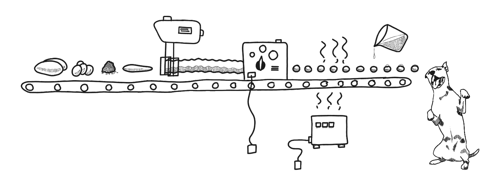 Helt fra de er råvarer til de triller ned i posen du holder i. Først blir råvarene mikset i miksepulten, før de forsvinner inn i kulelageren hvor de blir kulerunde. Deretter er det "The heat is on" før de opplever litt good times og triller videre ned i posene våre.